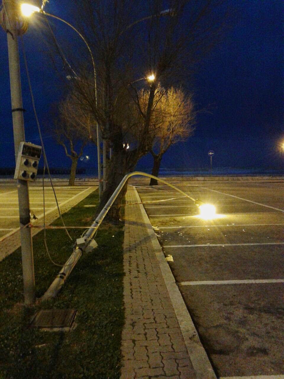 Nel posteggio di fronte al pontile, di fianco al palazzo del Mare a Roseto si è abbattuto sull’asfalto, occupando un posto auto, un palo dell’illuminazione pubblica. Come potete ammirare ancora funzionante. Quindi porta corrente e sta illuminando il piazzale in attesa di qualche elettricista che lo metta in sicurezza.