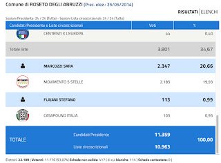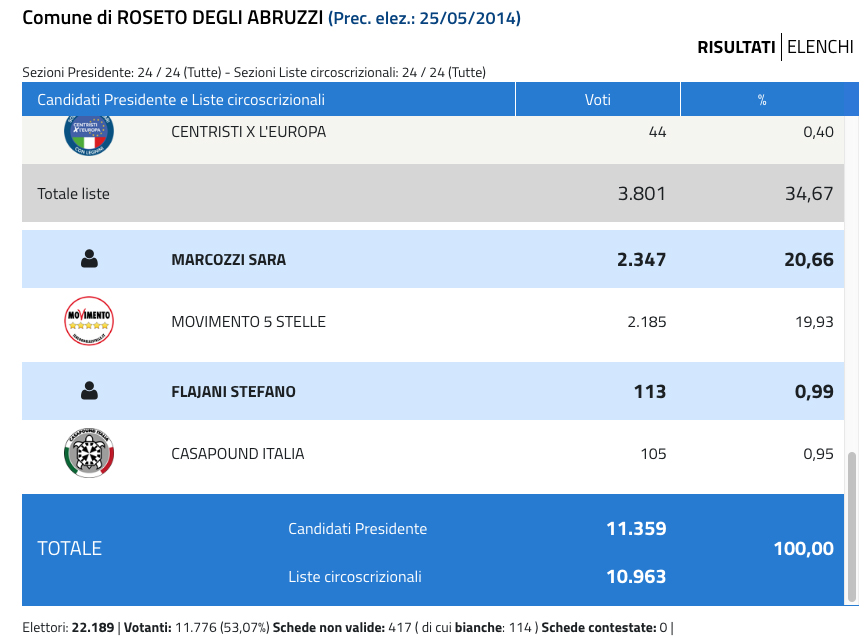 Politica Abruzzo Roseto degli Abruzzi, elezioni Regione Abruzzo, risultati Marcozzi e Flajani 11 Febbraio 201926 Febbraio 2019 Redazione Roseto degli Abruzzi elezioni per elezione Regione Abruzzo 2019.Qui sotto riportiamo i dati finali: Sara Marcozzi e Stefano FlajaniElettori: 22.189Votanti: 11.776 (53,07%)Schede non valide: 417 ( di cui bianche: 114 )Schede contestate: 0