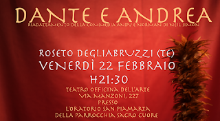 La commedia che sarà presentata a Roseto degli Abruzzi è un libero adattamento della celebre commedia “Andy & Norman” del drammaturgo statunitense Neil Simon questa l’opera della compagnia teatrale “Controspot”. Nata dalla fusione tra il talento e il coraggio di giovani attori diplomati alla Scuola di Cinema “IFA” di Pescara, la compagnia Controspot porterà in scena, commedia “Dante & Andrea”: la storia di due ragazzi squattrinati – interpretati rispettivamente da Giuseppe Di Simone e Andrea Di Luigi – che sbarcano il lunario gestendo una rivista alternativa. Il già precario equilibrio economico della simpatica coppia di amici viene messo a dura prova dall’arrivo di una giovane e bella vicina di casa (Jenny Nespoli) che, calamitando su di sé tutta l’attenzione dei baldi redattori, li porterà sull’orlo della bancarotta. Inizia qui la parte più divertente della commedia durante la quale gli spettatori potranno godere delle peripezie dei protagonisti intenti a sfuggire ai numerosi creditori. Andrea Di Luigi in una nota spiega che: “Ci siamo buttati in un’esperienza davvero stimolante, abbiamo deciso di metterci in gioco gestendo autonomamente la realizzazione di questa commedia”. Due ore di divertimento e si rifletterà col sorriso su quelli che sono i rapporti umani: interpersonali, amicali e sentimentali e sul precariato con tanto umorismo. Lo spettacolo Dante & Andrea è realizzato dalla Compagnia Controspot e sostenuto dall’Associazione Salām. L’intero ricavato sarà devoluto all’Associazione Salām per il progetto I figli della pace. Sarà in scena venerdì 22 febbraio nel Teatro Officina Dell’Arte in Via Manzoni, 227, presso l’oratorio San Piamarta della parrocchia Sacro Cuore.